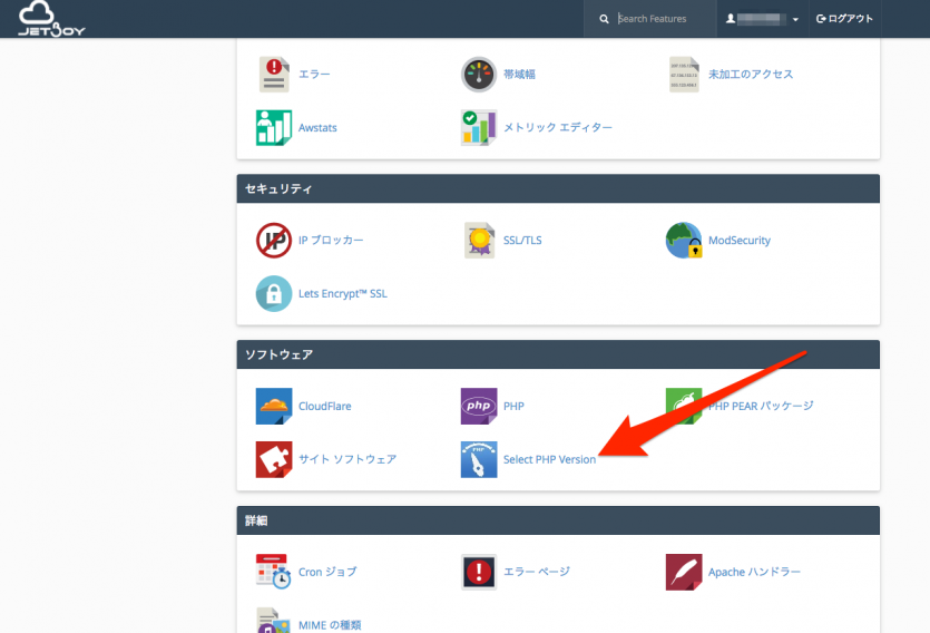 cPanelにログインしたら「ソフトウェア」項目にある「Select PHP Version」をクリックします。