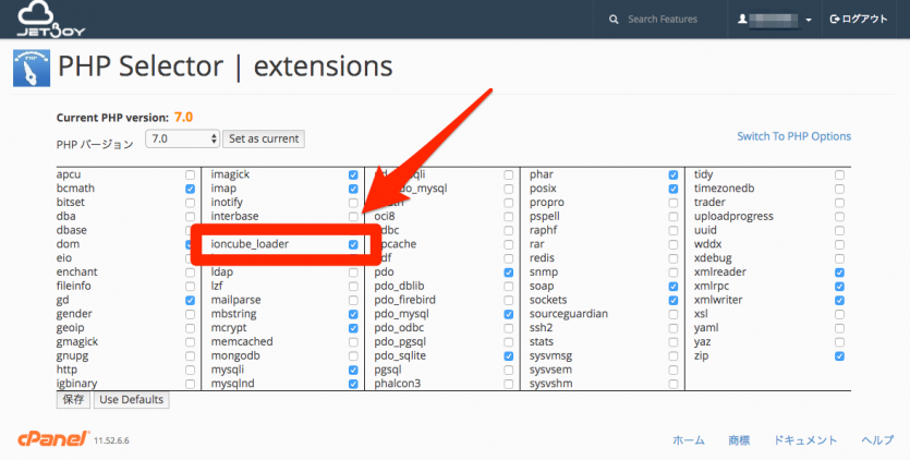 JETBOYではサーバーの管理にcPanelというソフトを使っているので、ioncubeもcPanelから設定します。